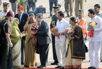 Earlier, the President was received and welcomed at the airport by Governor Hansraj Bhardwaj, Education Minister Dr V S Acharya, Deputy Commissioner of Udupi District Hemalatha P., President of Jilla Panchayath Udupi Gladis Almeida, President of Municipal Corporation Udupi Kiran Kumar, Chancellor Manipal University Dr Ramdas and his wife, Pro Chancellor Dr H S Ballal, Vice-Chancellor K. Ramnarayan and others.