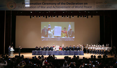 SEOUL, March 14: A flurry of anticipation filled the room of over 1,000 internationally-renowned figures including heads of state, legal representatives, and media who convened at the Coex Auditorium here Sunday for the Proclamation Ceremony of the Declaration of Peace and Cessation of War.