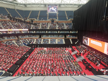 New School President David E. Van Zandt presided over the ceremony — the second consecutive year the university held its commencement exercises at the legendary tennis venue.