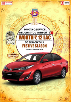 Commenting on the special festive offer, N. Raja, Deputy Managing Director, Toyota Kirloskar Motor, said “Considered auspicious, the festive season sees a spurt in consumer sentiments, we want to leave no stone unturned to ensure a joyous and lucrative ownership experience. Our innovative offers though "Q Service Festive Celebration" brings excitement to every customer which is our very own way of expressing gratitude to our loyal customers towards the trust and admiration shown through the year towards all our products & services.