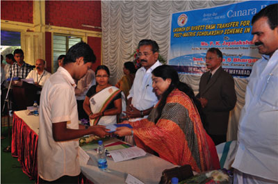 Continuing the series of program of Direct Cash Transfer, Canara Bank on 04.01.2013 rolled out a campaign in Waynad District for Post Matric scholarship for Schedule Tribe students. Ms T K Jayalakshmi, Kerala Minister for Welfare of Scheduled Tribes, Youth Affairs, Museum and Zoos, Govt. of Kerala launched the program at SKMJ School, Kalpetta and distributed the Passbooks and ATM card to 100 beneficiary students.
