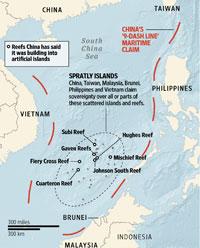 Under the UN Convention on the Law of the Sea, 12-nautical-mile limits cannot be set around man-made islands built on previously submerged reefs.