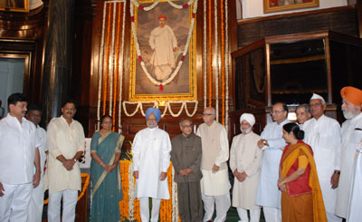NEW DELHI, July 23: Prime Minister Manmohan Singh; Lok Sabha Speaker Meira Kumar; Union Ministers and Leaders of Opposition in Parliament led the nation in paying floral tributes at the portrait of Lokamanya Bal Gangadhar Tilak in the Central Hall of Parliament House on his birth anniversary today.