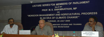 NEW DELHI, July 28: Prof. M.S. Swaminathan, M.P., delivered a talk on “Monsoon Management and Agricultural Progress in an era of Climate Change” at the Parliament House on Tuesday.