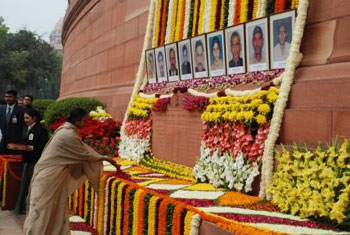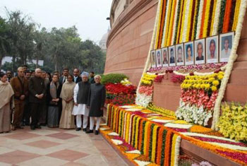 NEW DELHI, Dec 13: At a solemn function held in Parliament House on Sunday, Vice President and Chairman Rajya Sabha Mohd. Hamid Ansari, Prime Minister Dr. Manmohan Singh, Lok Sabha Speaker Meira Kumar, led the nation in paying tributes to the Martyrs who laid down their lives while defending the Parliament from the terrorist attack on December 13, 2001.