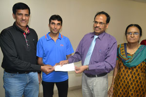 Mr A K Das, DGM, Canara Bank Social Action Cell, Head Office, handed over a cheque to Aanand Kumar.