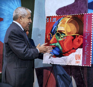 United Nations Postal Administration, the world body's postal agency, released the one-dollar stamp designed by a world famous Miami-based artist Ferdie Pacheco, with the Father of the Nation in red, blue and gold.