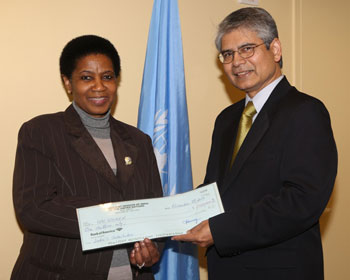 The cheque was received on behalf of UN Women, by Ms. Phumzile Mlambo-Ngcuka, Under Secretary General and Executive Director of UN Women.