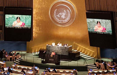 She also emphasised India’s commitment to the UN’s Sustainable Development Goals (SDGs), which she said, were “matched by the development vision of my government, which is geared towards the achievement of these same objectives”. Several schemes of the Indian government dovetailed with the SDGs, such as the Swachh Bharat, Beti Bachao, Beti Padhao, Make in India and Digital India campaigns.