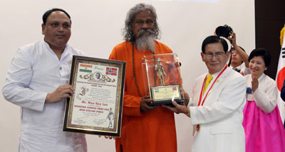 GYEONGGI (South Korea), July 19: Mr. Man Hee Lee, Chairman of Heavenly Culture, World Peace, Restoration of Light (HWPL) was honored with the “Mahatma Gandhi Prize for Non-Violent Peace” at the Peace Palace here on Tuesday. Dr. Prasanna Kumar Patasani, Chairman of Mahatma M.K. Gandhi Foundation for Nonviolent Peace, and Secretary-General Dr. Jyoti Mohapatra came to Korea for the prize award ceremony. Chairman Patasani is also a Parliament member of the 16th Lok Sabha (House of the People) of India.