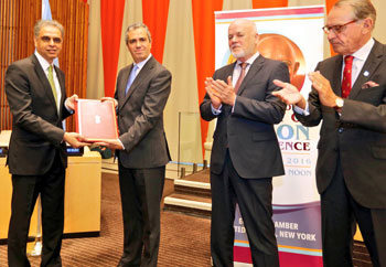Ambassador Syed Akbaruddin handed over the Instrument of Ratification signed by President Pranab Mukherjee, to Santiago Villalpando, the Head of the Treaties Division at the UN, at a special ceremony at United Nations attended by top officials and senior diplomats.
