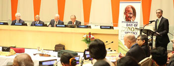 UNITED NATIONS, Oct 2: Mahatma Gandhi must have had a big smile on him today. On his 147th birth anniversary celebrated as "Gandhi Jayanti", Ambassador Sayed Akbaruddin, India's Permanent Representative to the UN, had lined up four major events to mark the International Day of Non-Violence here on Sunday.