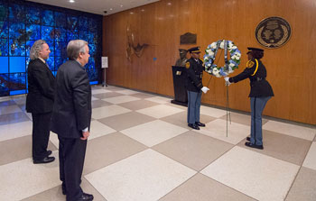 Mr. Guterres’ first day at UN Headquarters as Secretary General began with the laying of a wreath at the Memorial Wall in the Visitors’ Lobby.